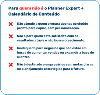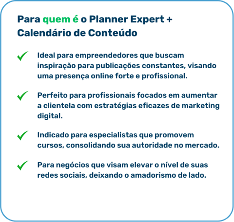 Se você se identifica com qualquer uma dessas afirmações, o "Planner Expert – Guia de Planejamento Estratégico" e o "Calendário de Conteúdos 2024" são perfeitos para você. Juntos, essas ferramentas proporcionam uma abordagem completa para revolucionar seu planejamento e execução de estratégias de marketing e gestão, assegurando que suas metas de negócios sejam não apenas alcançadas, mas superadas.