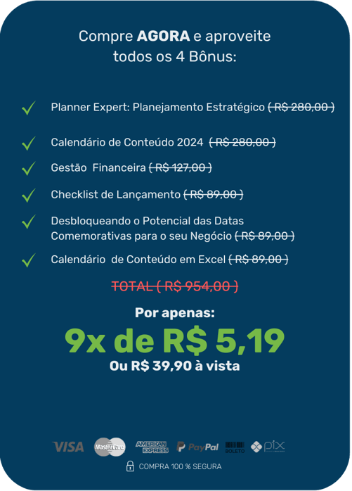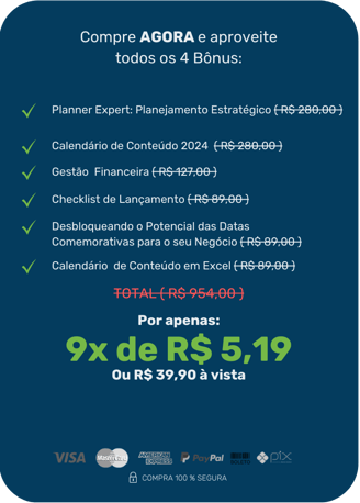 Estamos confiantes de que o "Planner Expert – Guia de Planejamento Estratégico" e o "Calendário de Conteúdos 2024" vão revolucionar a maneira como você planeja e executa as estratégias de marketing e gestão da sua empresa. Se, por qualquer motivo, não atenderem às suas expectativas nos primeiros 7 dias, garantimos o reembolso integral do seu investimento.